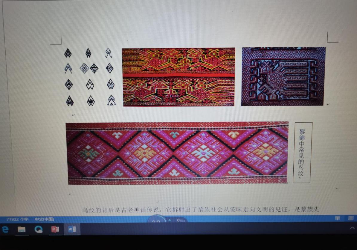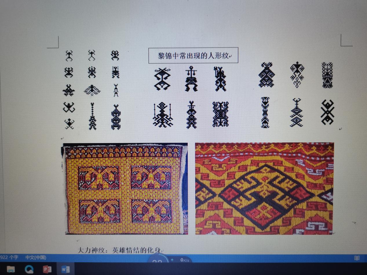 高老师用大量的物证图片说明黎族五大方言区的黎锦在构图、传统图案、色彩等方面的差异,例如美孚方言区的扎染技艺、润方言区的双面绣、罐首衣等。哈方言区妇女的织锦图案多以人形纹、动物纹为主,植物纹、生产工具纹以及自然界的各种纹样为辅,图案造型生动、构图饱满、色彩浓烈、内容丰富、概括性强,比较著名的有“婚礼图”、“收获祭祀图”、“鱼猎农耕图”等。黎锦传统图案的特点是简洁、对称。常见的图案有青蛙纹、人形纹、大力神(袍隆扣)、鸟纹、龙纹、花纹等。