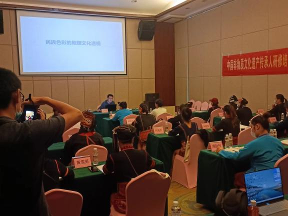 刘教授的课程《民族与色彩》结合非遗传承人的基本生活背景和知识结构,有针对性地介绍国内外主要民族的文化属性与艺术审美特征,主要民族民间的民风民俗、民间艺术特色及乡土文化遗产资源的保护传承与利用现状。重点从人对色彩的知觉和心理效应出发,用科学的分析方法,把复杂的色彩现象还原为基本要素,利用色彩在环境、量与质上的可变幻性,按照一定的规律去组合各构成之间的相互关系,再创造出新的色彩组合的过程。通过大量实例的分析,让非遗传承人能够更好地了解色彩的基本常识与创作规律,并运用到现代黎锦创作与文创产品研发中。